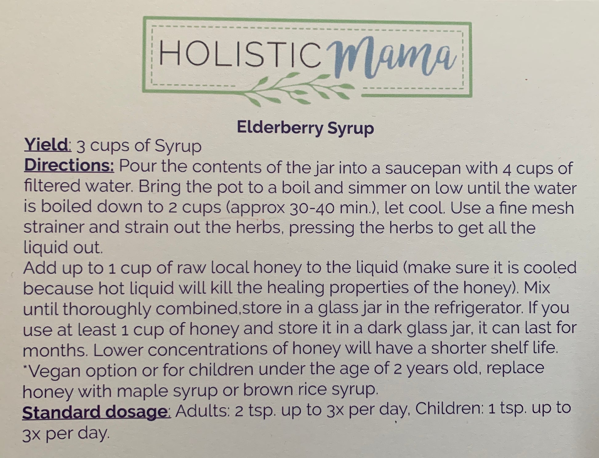 Directions: Pour the contents of the bag into a saucepan with 4 cups of filtered water. Bring the pot to a boil and simmer on low until the water is boiled down to 2-3 cups (approx 30-40 min.), let cool. Use a fine mesh strainer and strain out the herbs, pressing the herbs to get all the liquid out. Add up to 1 cup of raw local honey to the liquid (make sure it is cooled because hot liquid will kill the healing properties of the honey). Mix until thoroughly combined, store in a glass jar in the refrigerator. If you use at least 1 cup of honey and store it in a dark glass jar, it can last for months. Lower concentrations of honey will have a shorter shelf life.