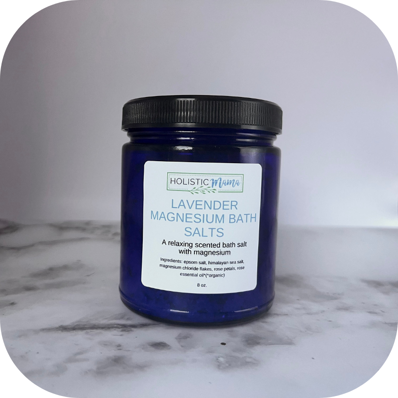 Lavender Ingredients: Epsom salt, Himalayan sea salt, magnesium chloride flakes, lavender buds, lavender essential oil